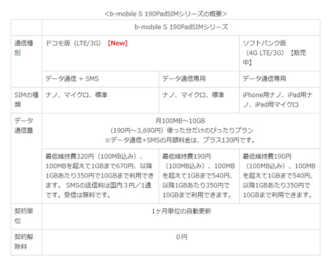 日本通信のデータ専用 B Mobile S 190padsim にドコモ版登場 Sms対応simも用意 Itmedia Mobile